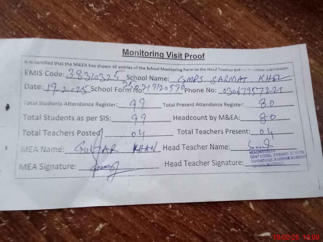 | Attendance Register | Head Teacher | MEA with School | Visit Proof |