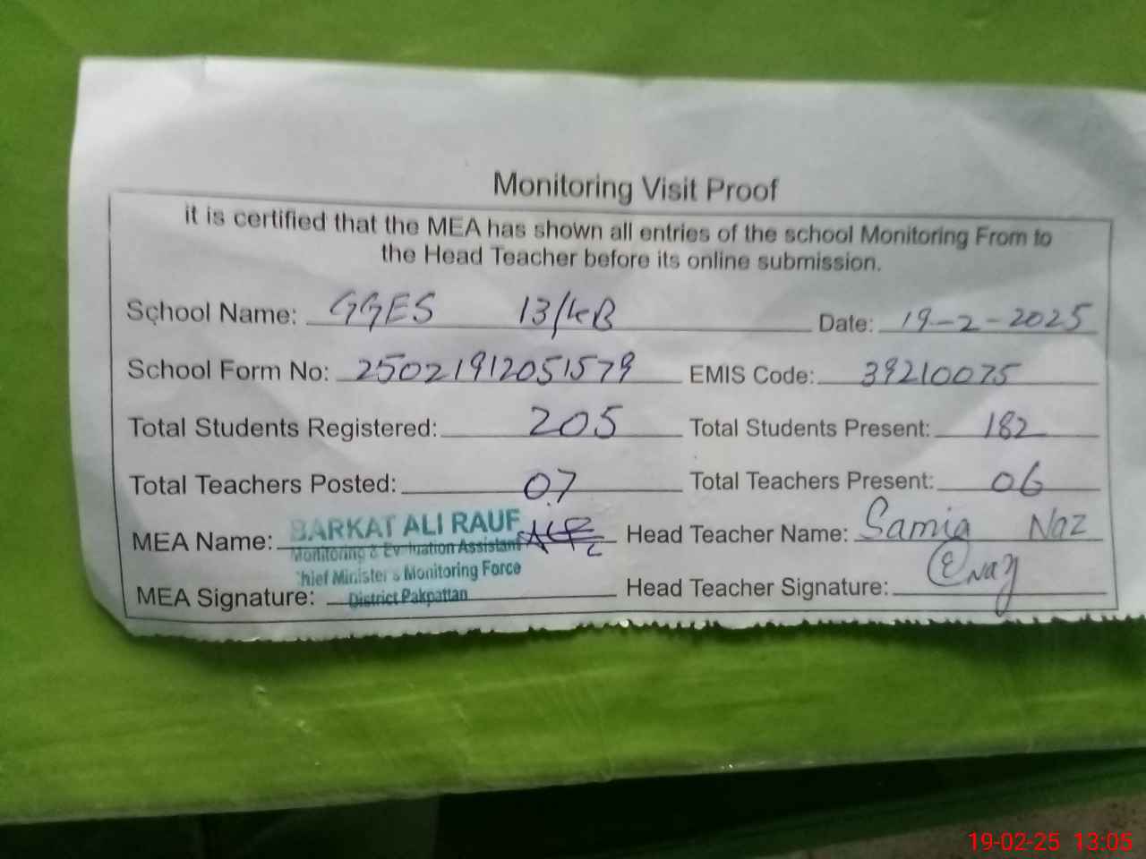 | Certified that this School was Inspected by the Undersigned MEA/DMO Today and the Information Stated Above is as Per Record. | |||||