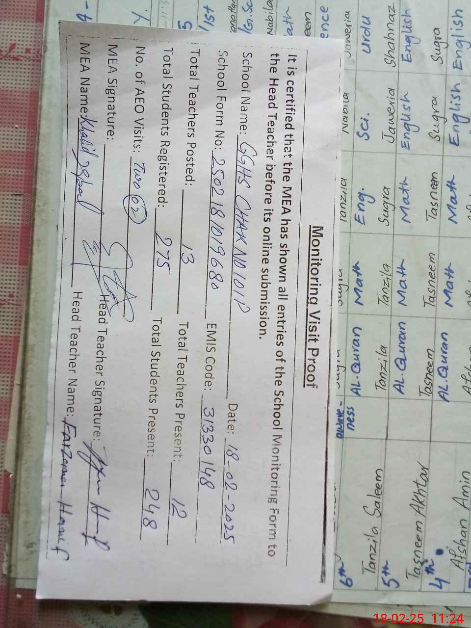 | Attendance Register | Head Teacher | MEA with School | Visit Proof |
