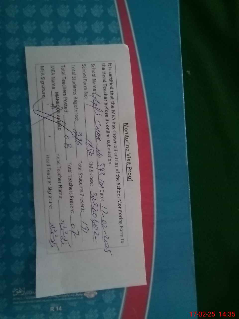 | Certified that this School was Inspected by the Undersigned MEA/DMO Today and the Information Stated Above is as Per Record. | |||||