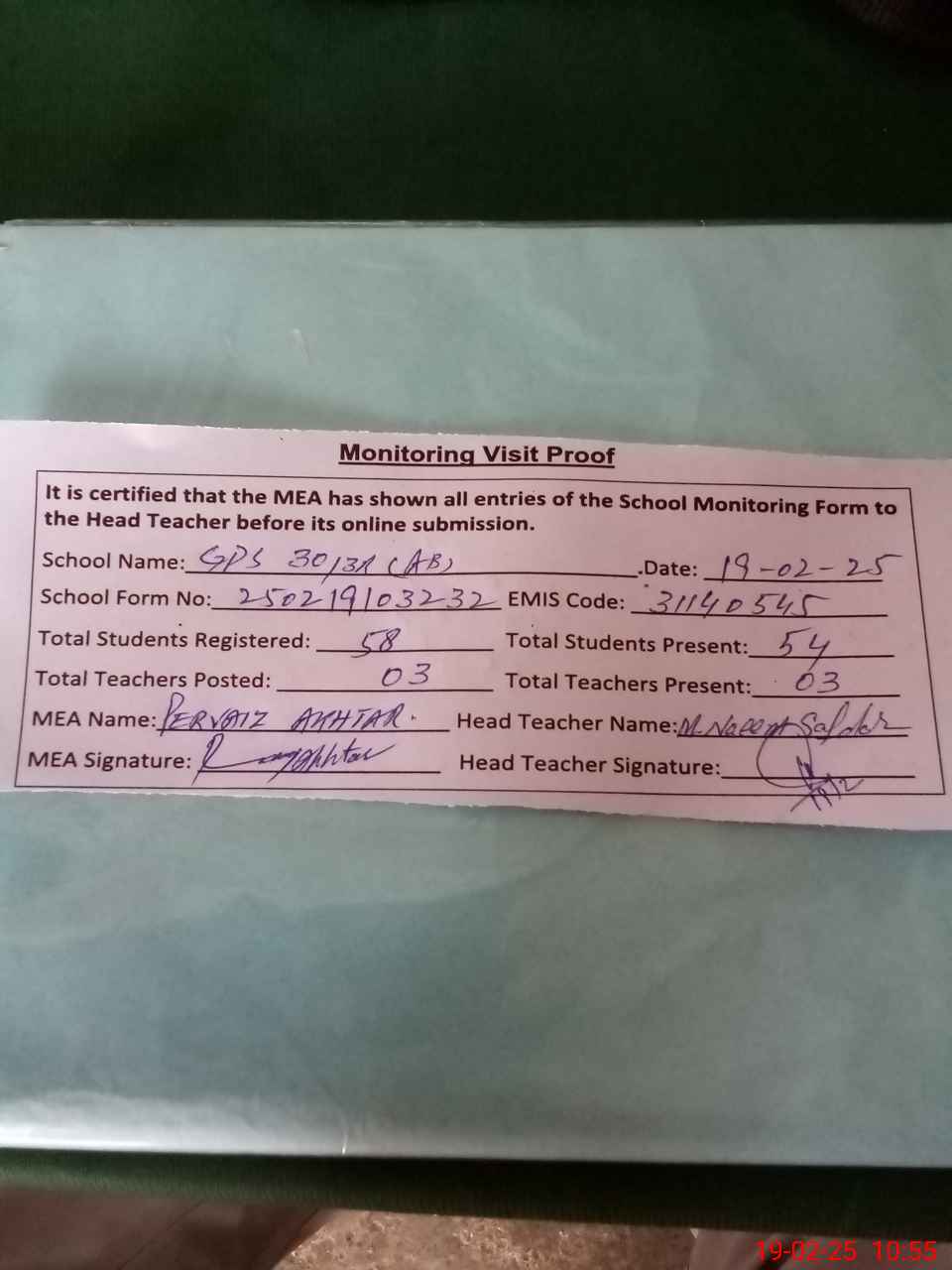 | Certified that this School was Inspected by the Undersigned MEA/DMO Today and the Information Stated Above is as Per Record. | |||||