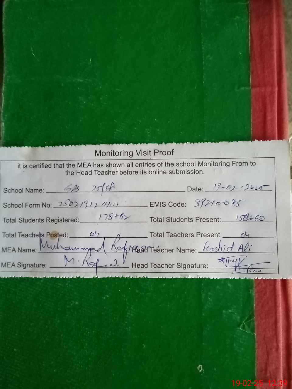 | Attendance Register | Head Teacher | MEA with School | Visit Proof |