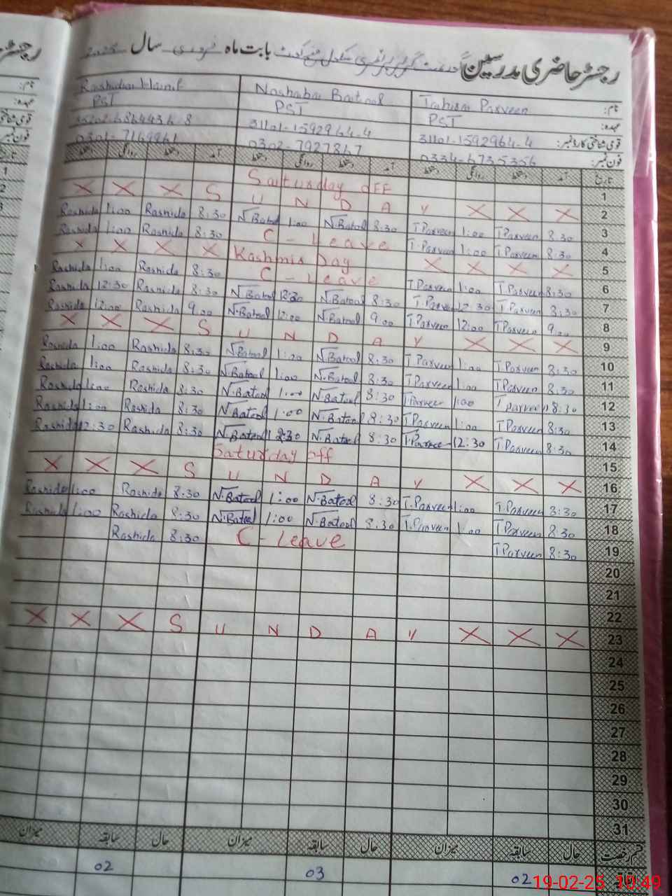 | CNIC | Full Name | Designation | R/C | Absence During Last Calender Month |
