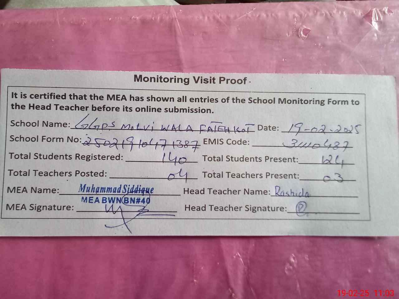 | Attendance Register | Head Teacher | MEA with School | Visit Proof |