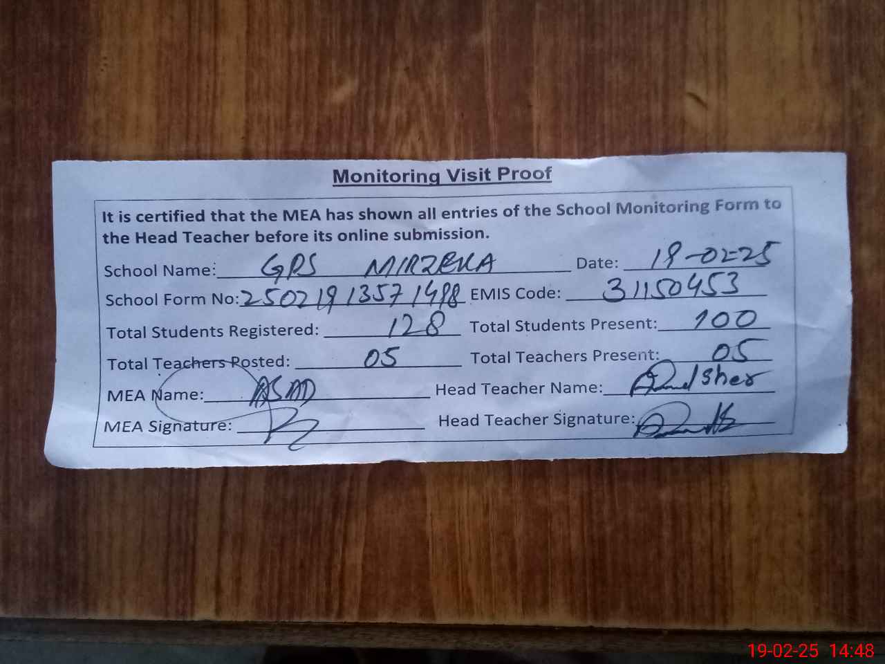| Attendance Register | Head Teacher | MEA with School | Visit Proof |
