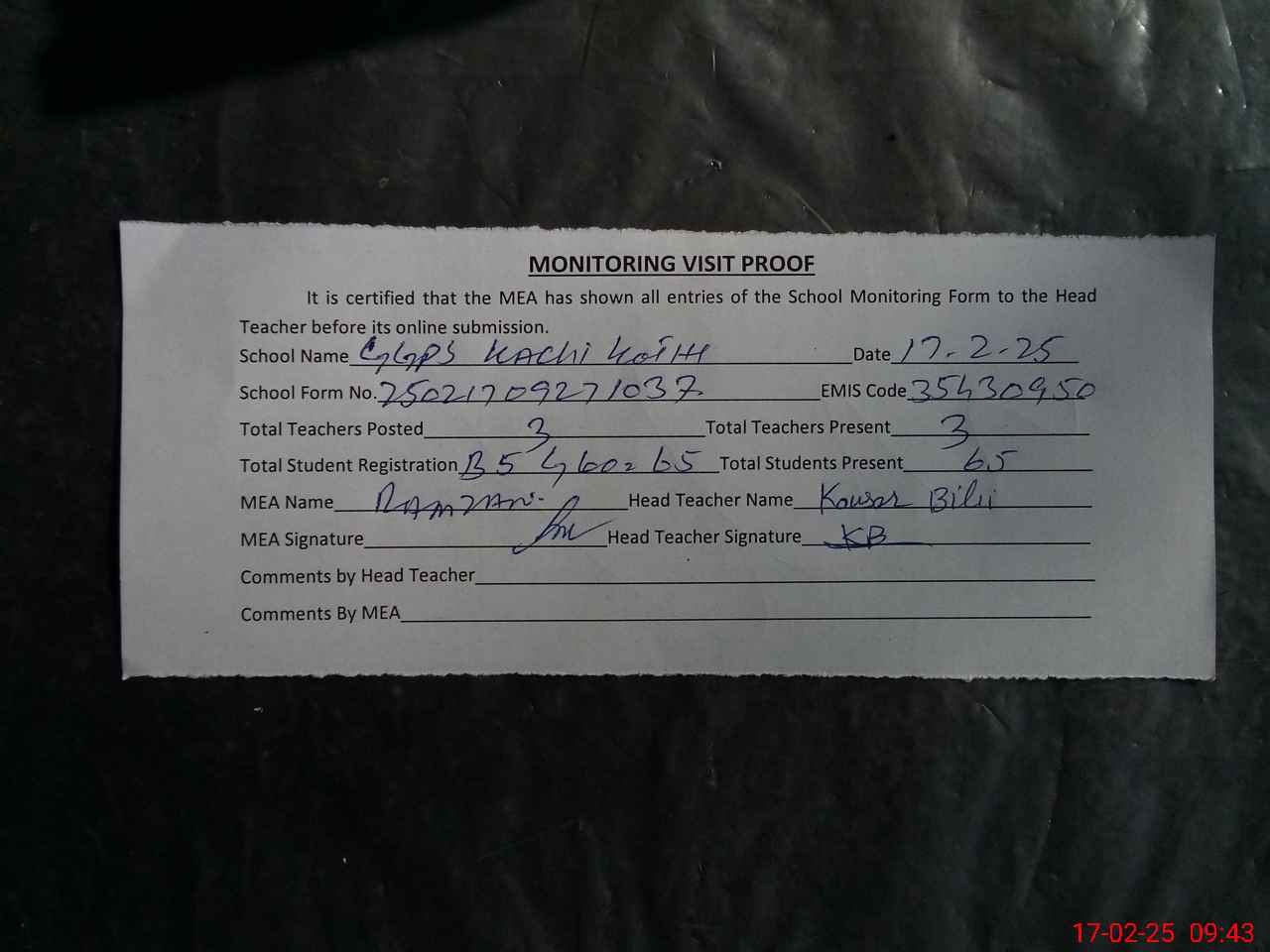| Attendance Register | Head Teacher | MEA with School | Visit Proof |