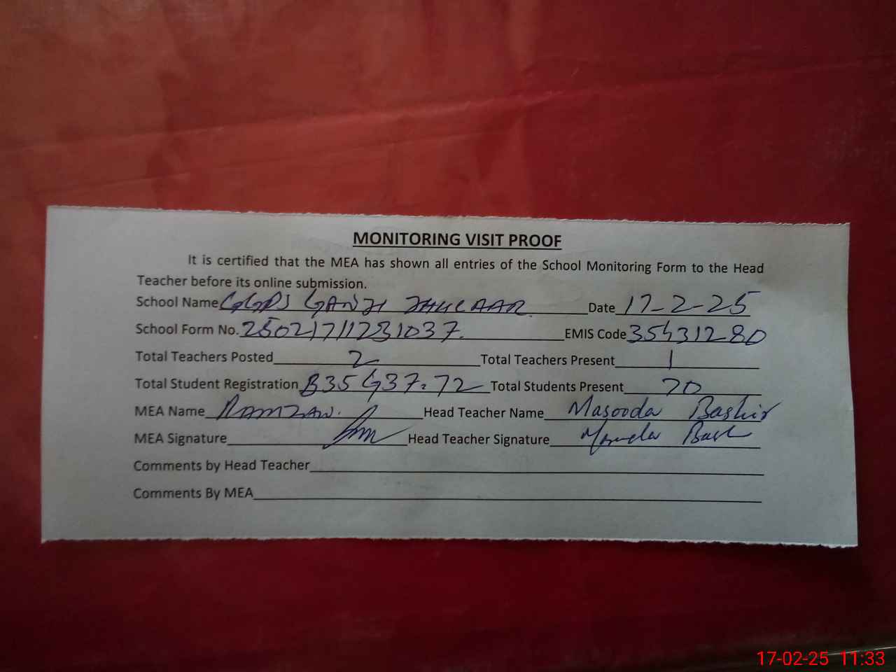 | Attendance Register | Head Teacher | MEA with School | Visit Proof |