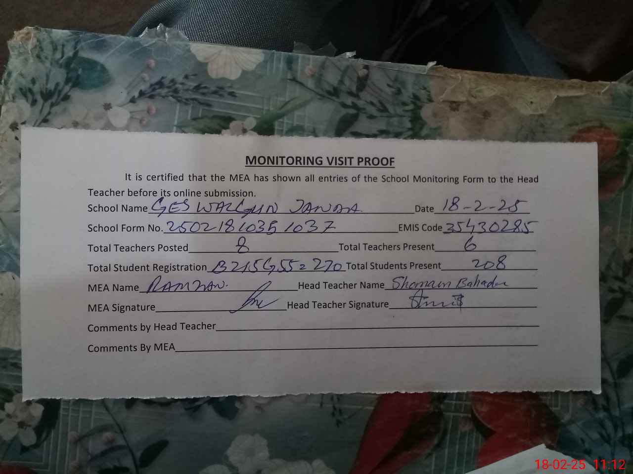 | Attendance Register | Head Teacher | MEA with School | Visit Proof |