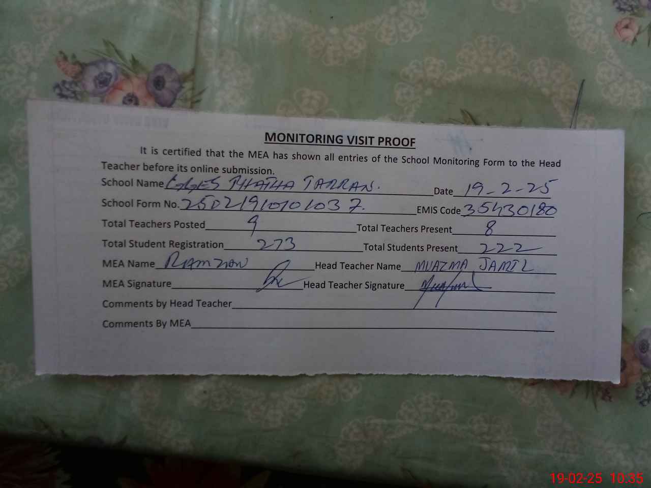 | Certified that this School was Inspected by the Undersigned MEA/DMO Today and the Information Stated Above is as Per Record. | |||||