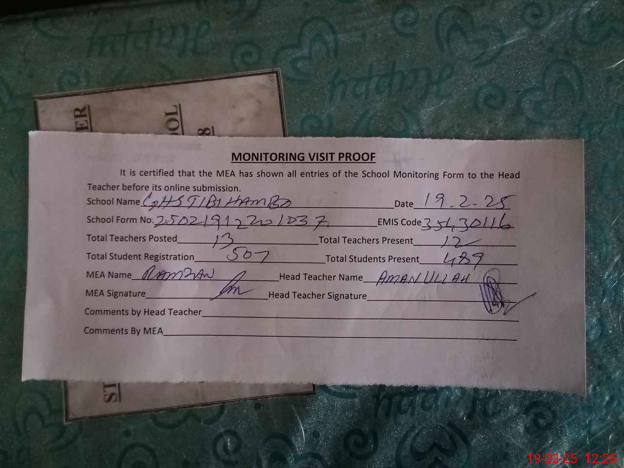 | Attendance Register | Head Teacher | MEA with School | Visit Proof |