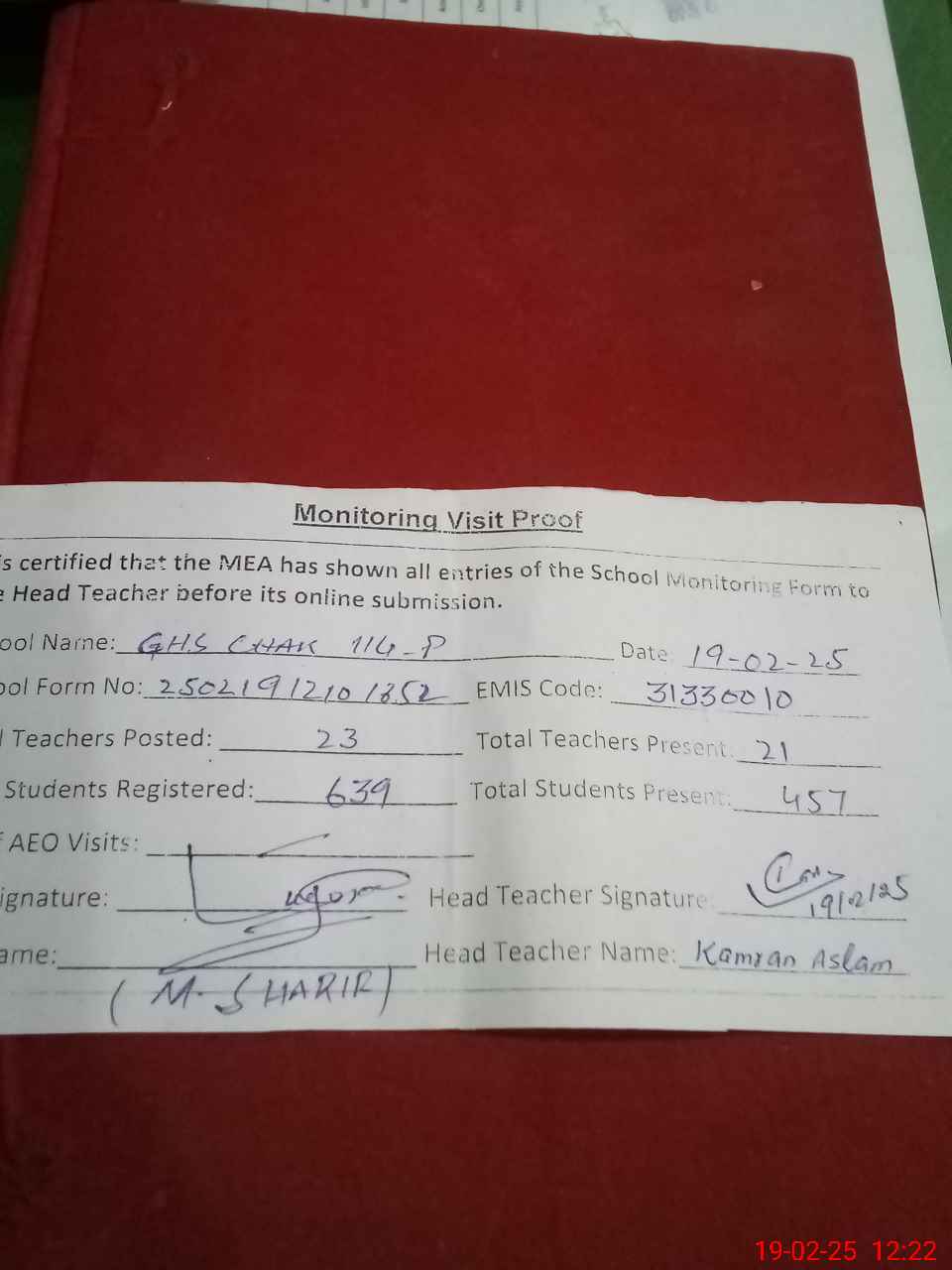 | Attendance Register | Head Teacher | MEA with School | Visit Proof |
