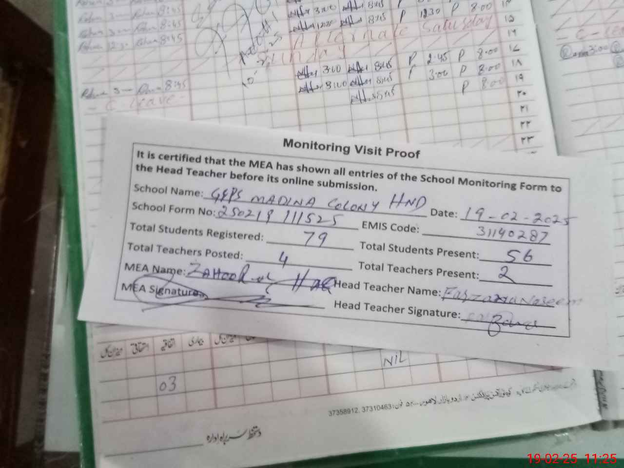 | Attendance Register | Head Teacher | MEA with School | Visit Proof |