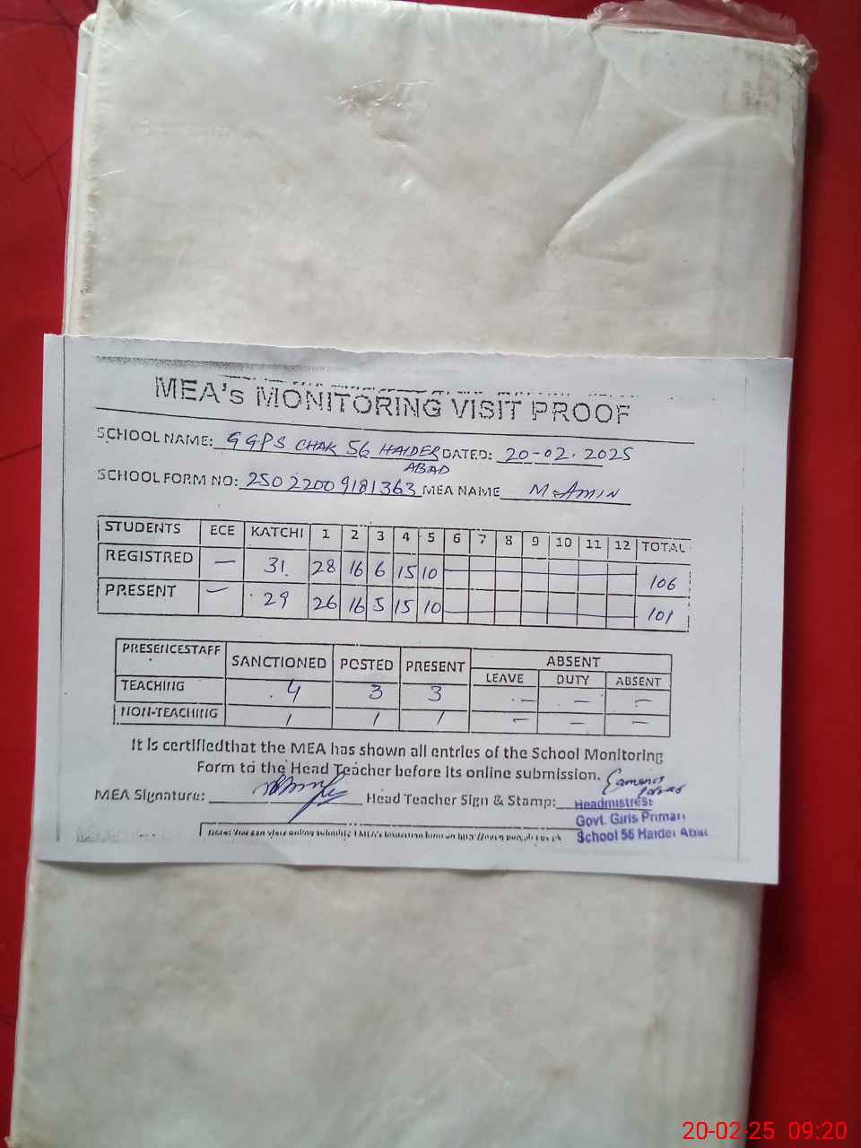 | Attendance Register | Head Teacher | MEA with School | Visit Proof |