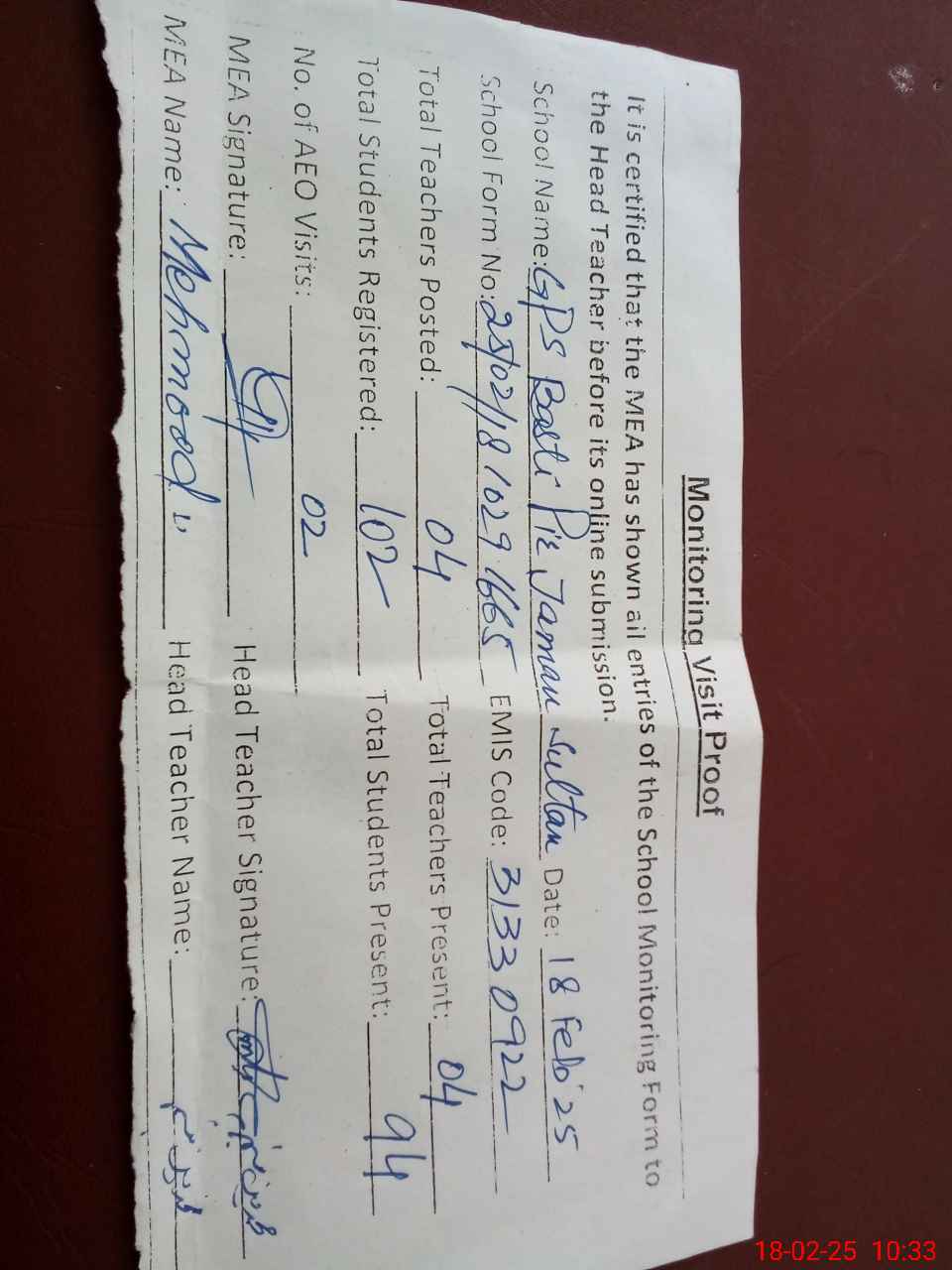 | EMIS Code: 31330922 | Name of School: GPS BASTI PIR JAMAN SULTAN | |||