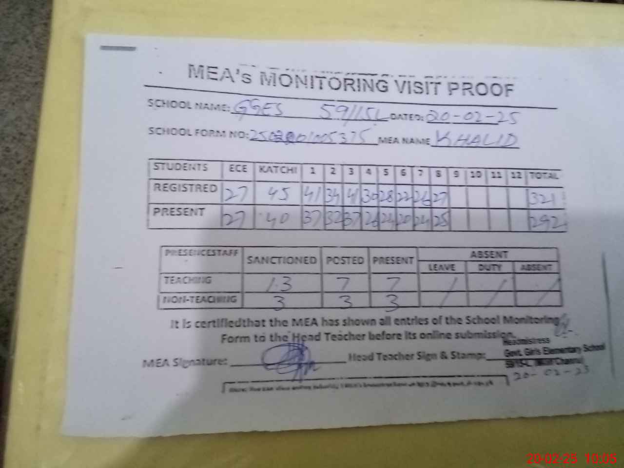 | Attendance Register | Head Teacher | MEA with School | Visit Proof |