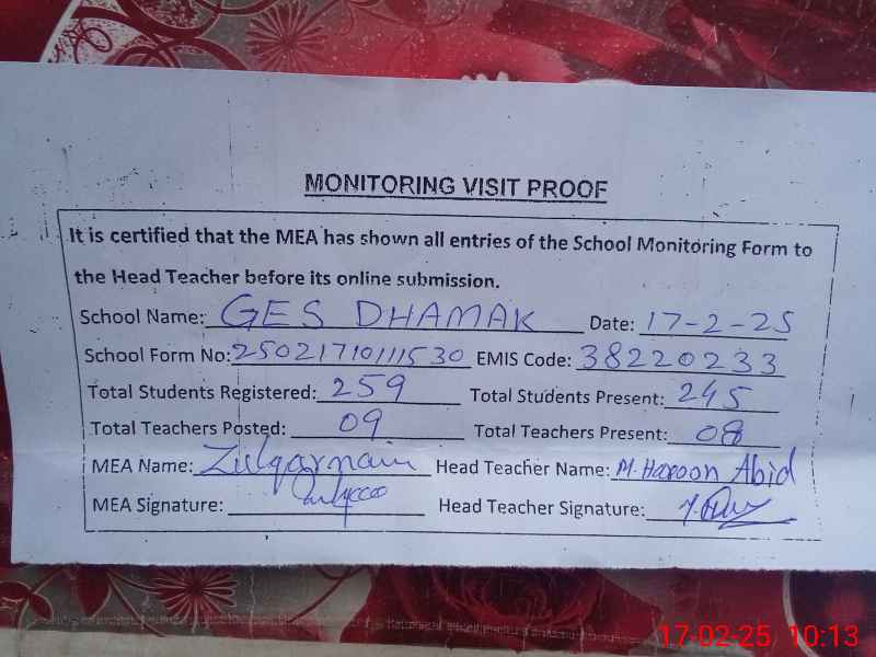 | Certified that this School was Inspected by the Undersigned MEA/DMO Today and the Information Stated Above is as Per Record. | |||||