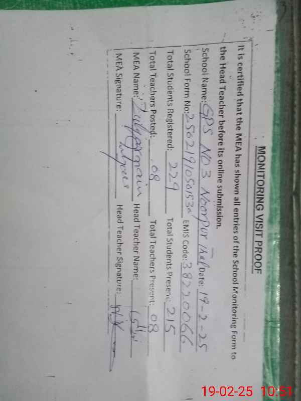 | EMIS Code: 38220066 | Name of School: GPS NO. 3 NOOR PUR THAL | |||