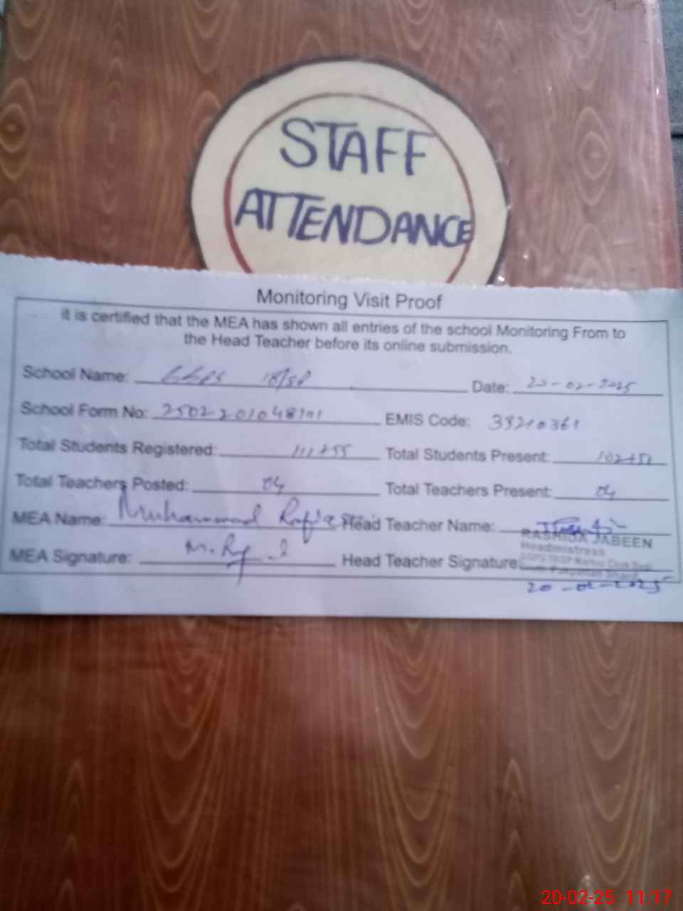 | Attendance Register | Head Teacher | MEA with School | Visit Proof |