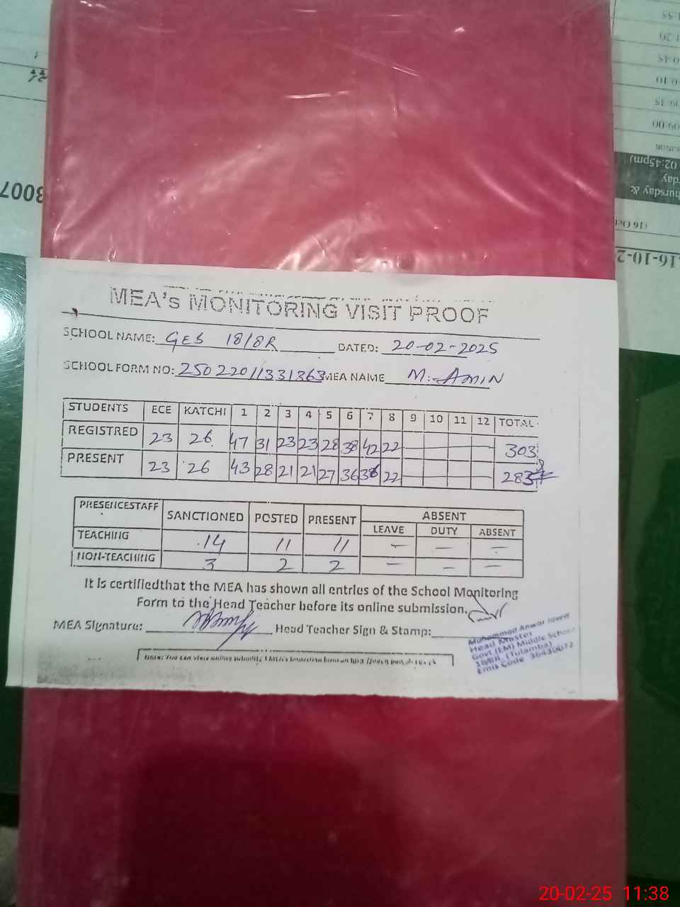 | Attendance Register | Head Teacher | MEA with School | Visit Proof |