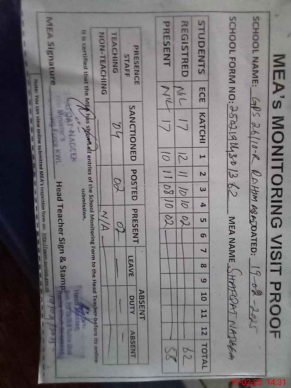 | Attendance Register | Head Teacher | MEA with School | Visit Proof |