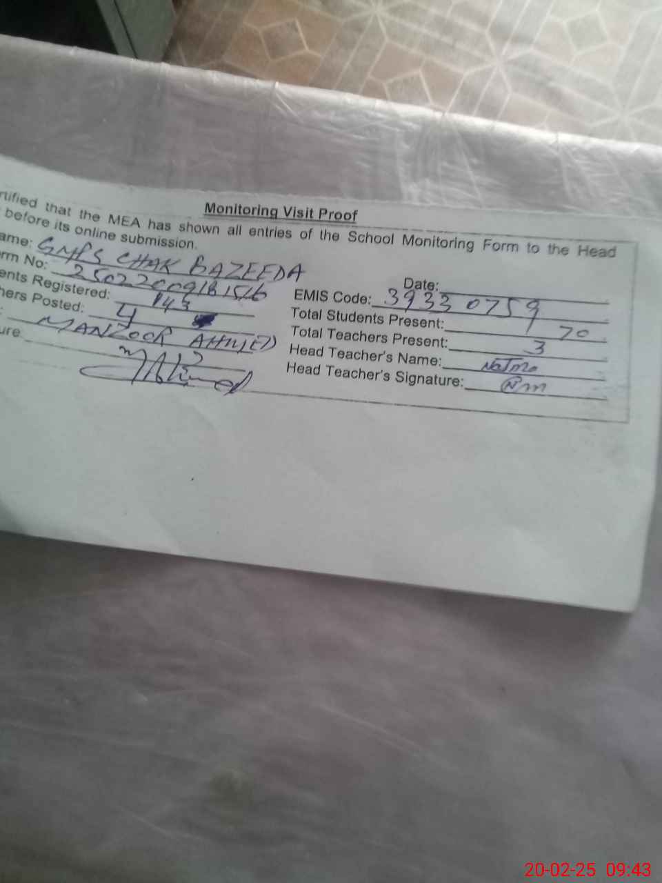 | EMIS Code: 39330759 | Name of School: GMPS CHAK BAZEEDA | |||