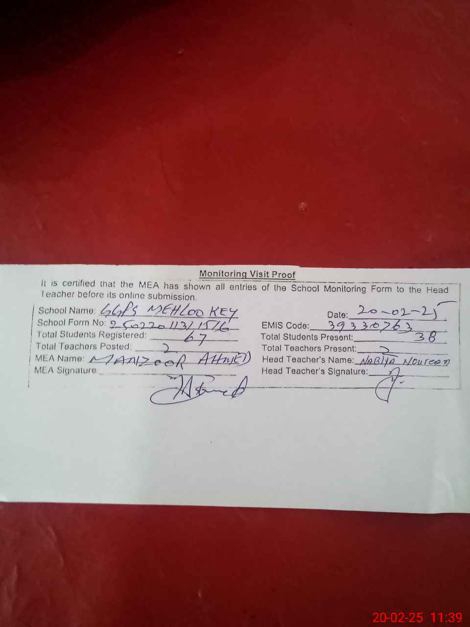 | Attendance Register | Head Teacher | MEA with School | Visit Proof |