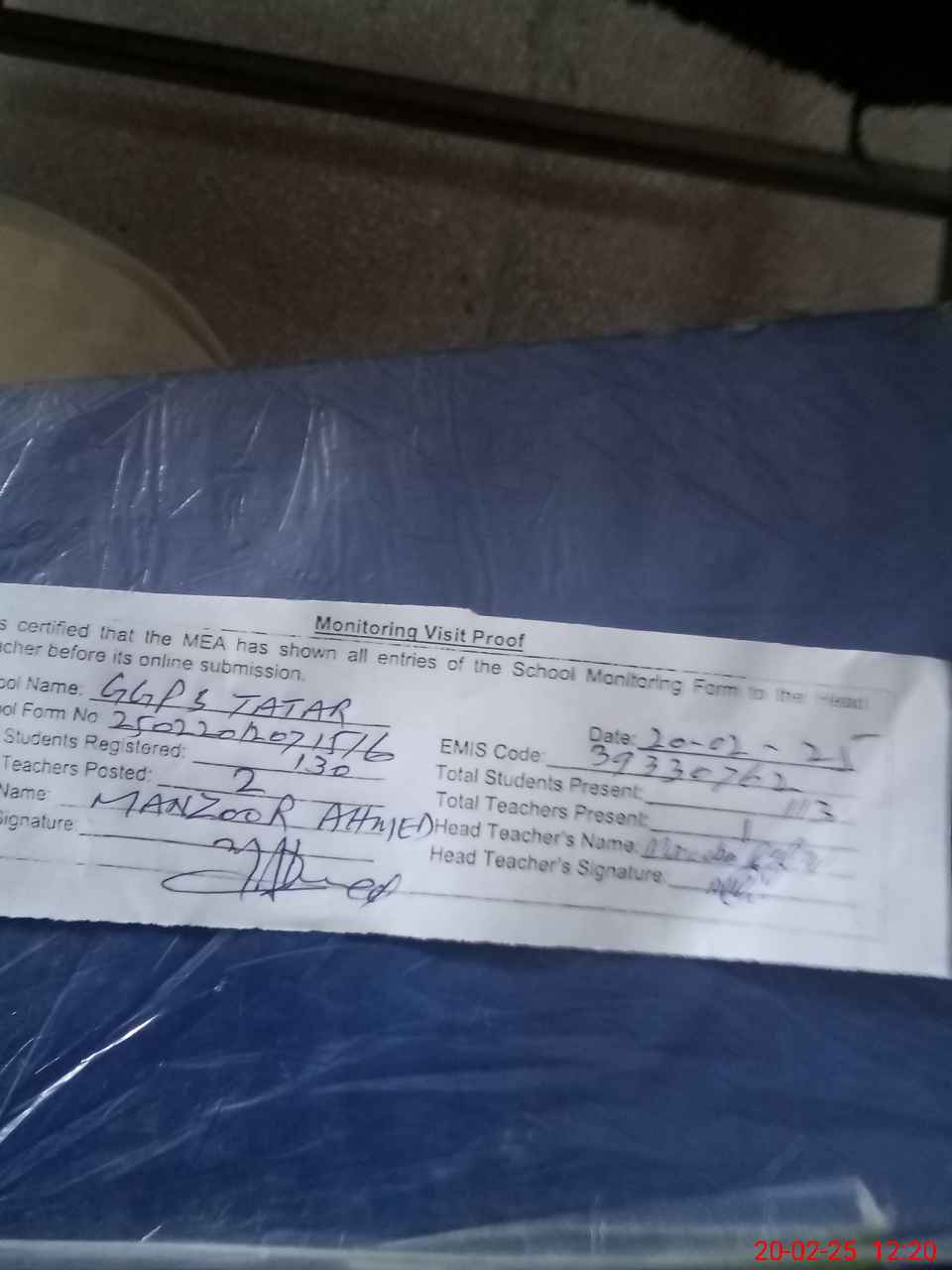 | Attendance Register | Head Teacher | MEA with School | Visit Proof |