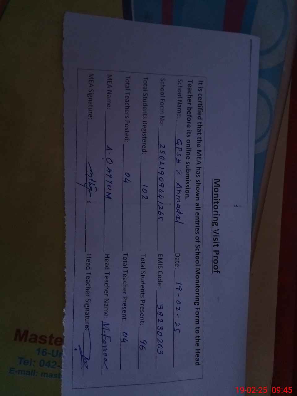 | Attendance Register | Head Teacher | MEA with School | Visit Proof |
