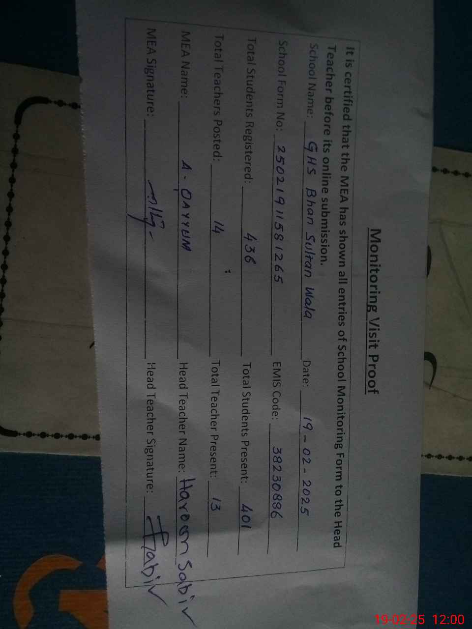 | Attendance Register | Head Teacher | MEA with School | Visit Proof |
