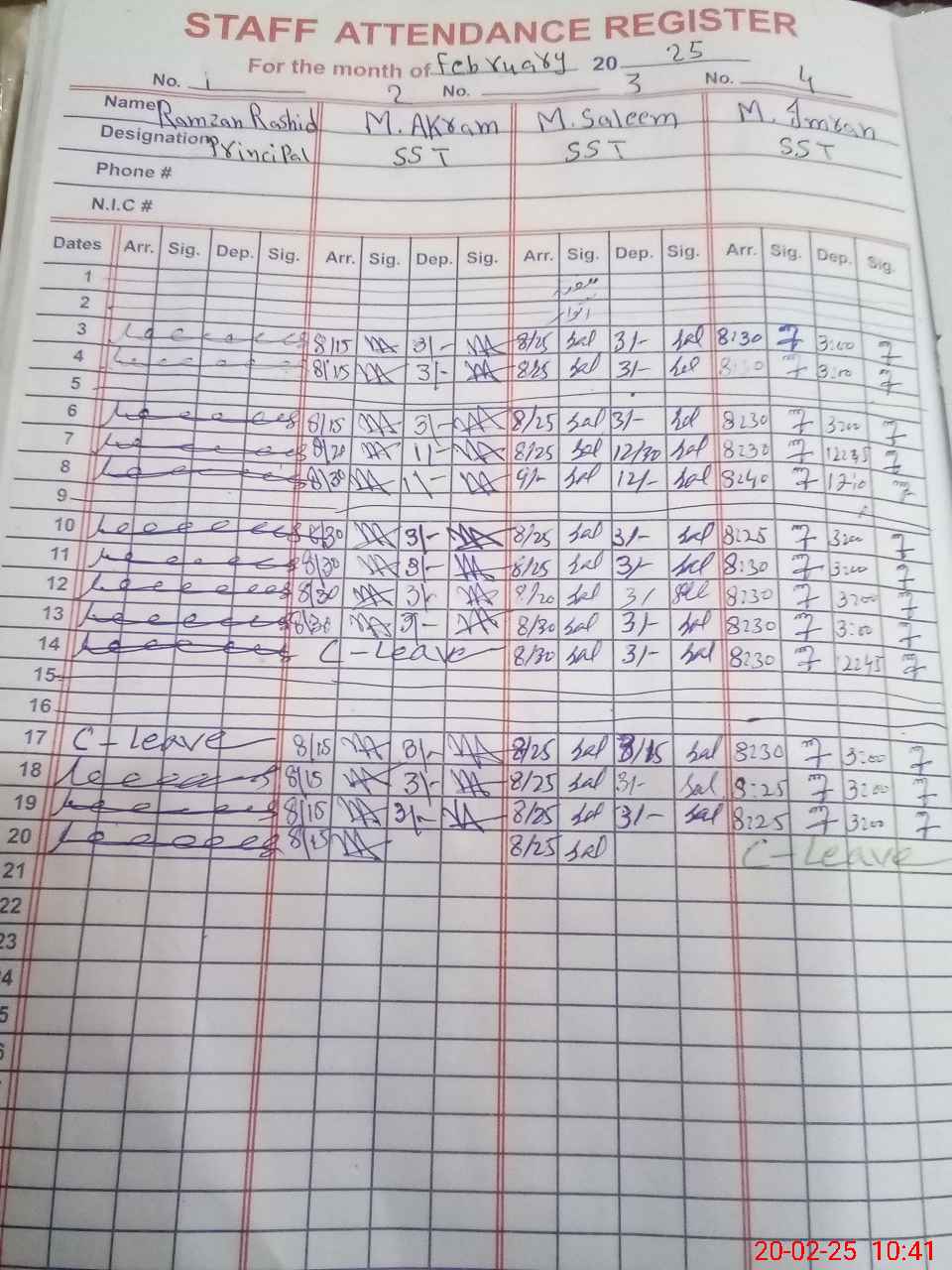| CNIC | Full Name | Designation | R/C | Absence during last cal. month |
