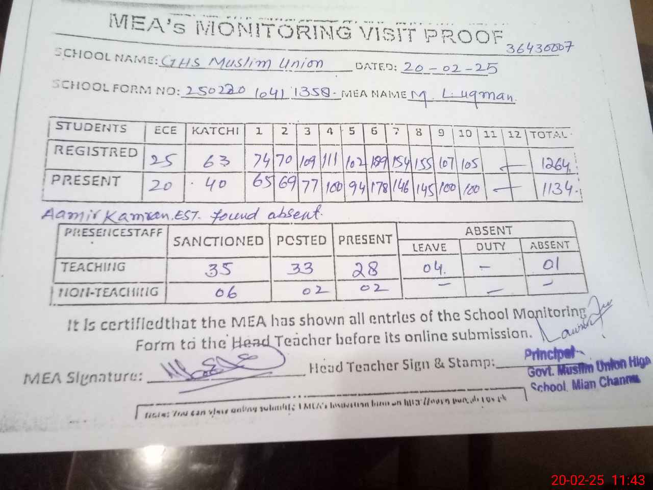 | Attendance Register | Head Teacher | MEA with School | Visit Proof |