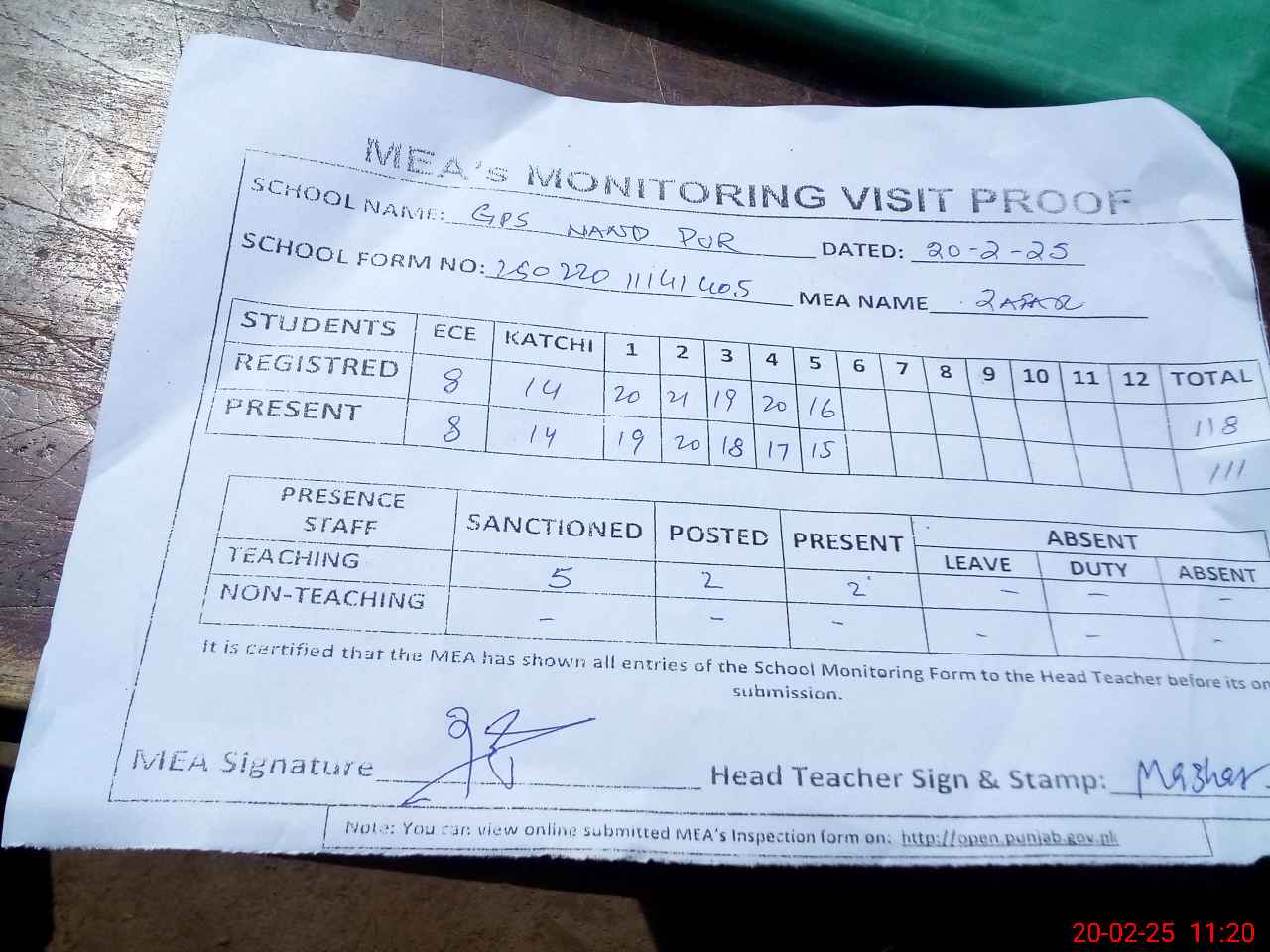 | Attendance Register | Head Teacher | MEA with School | Visit Proof |