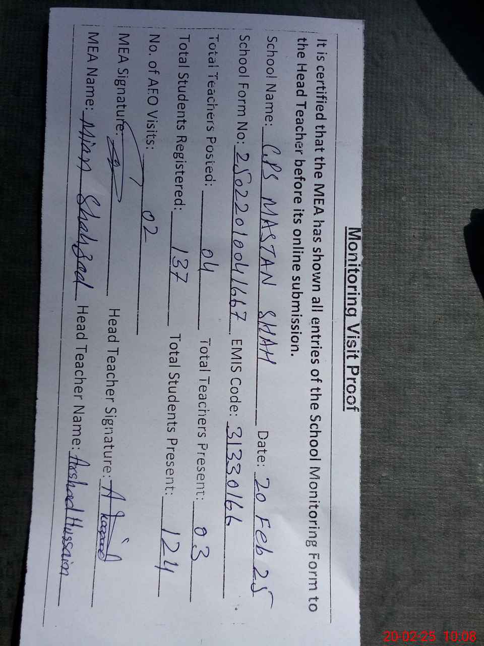 | Attendance Register | Head Teacher | MEA with School | Visit Proof |