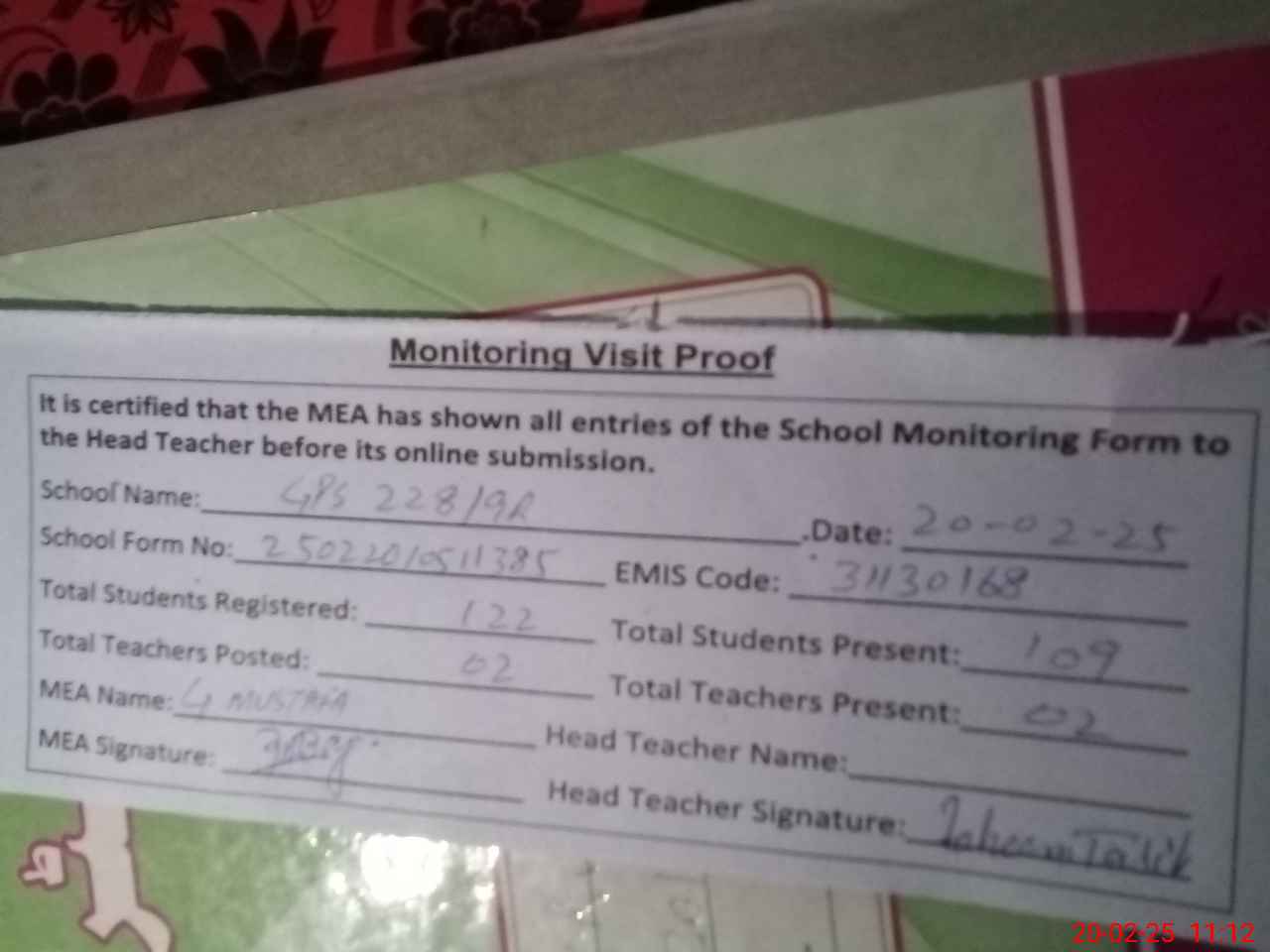 | EMIS Code: 31130168 | Name of School: GPS CHAK 228/9-R | |||