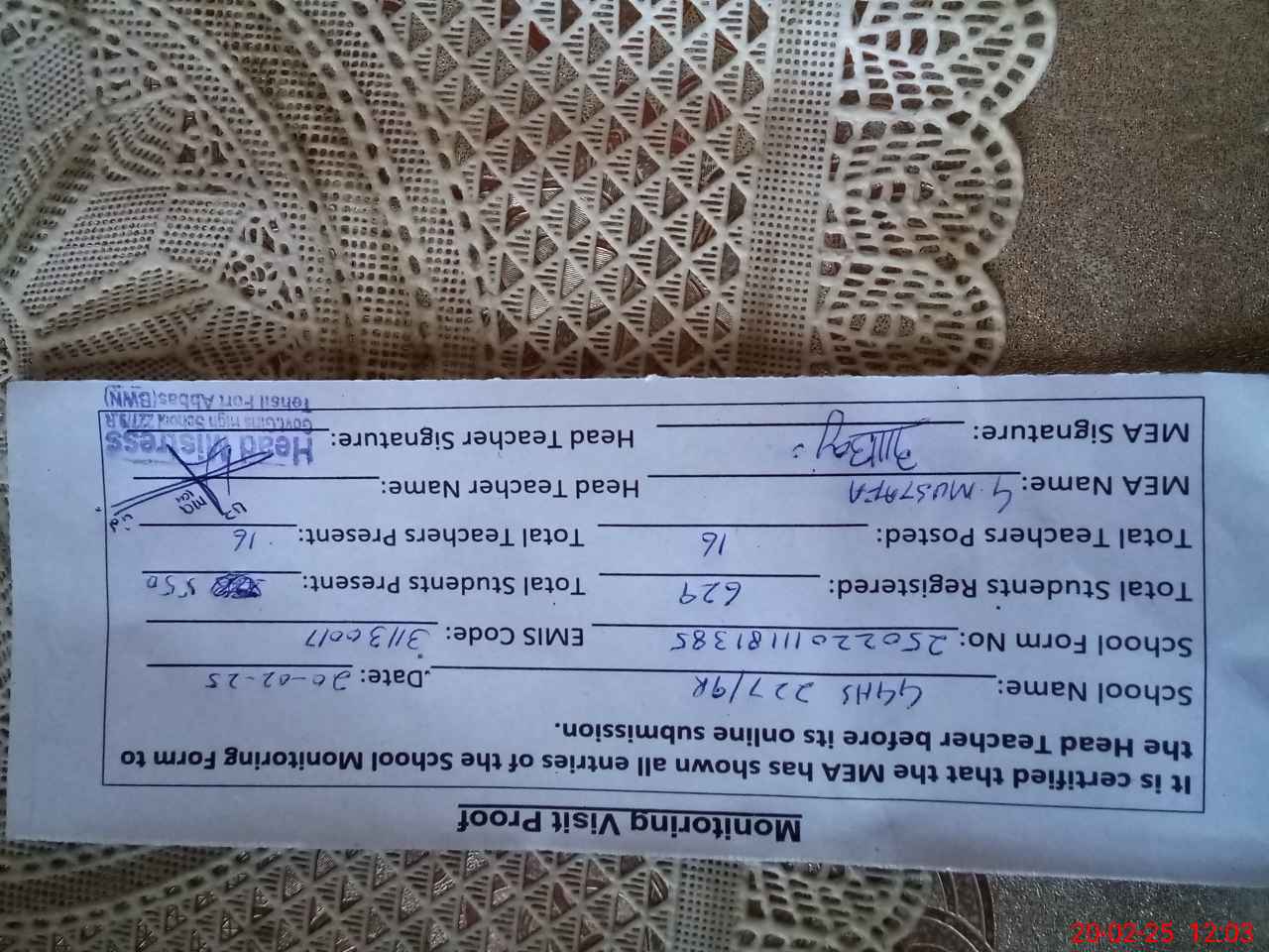 | Certified that this School was Inspected by the Undersigned MEA/DMO Today and the Information Stated Above is as Per Record. | |||||