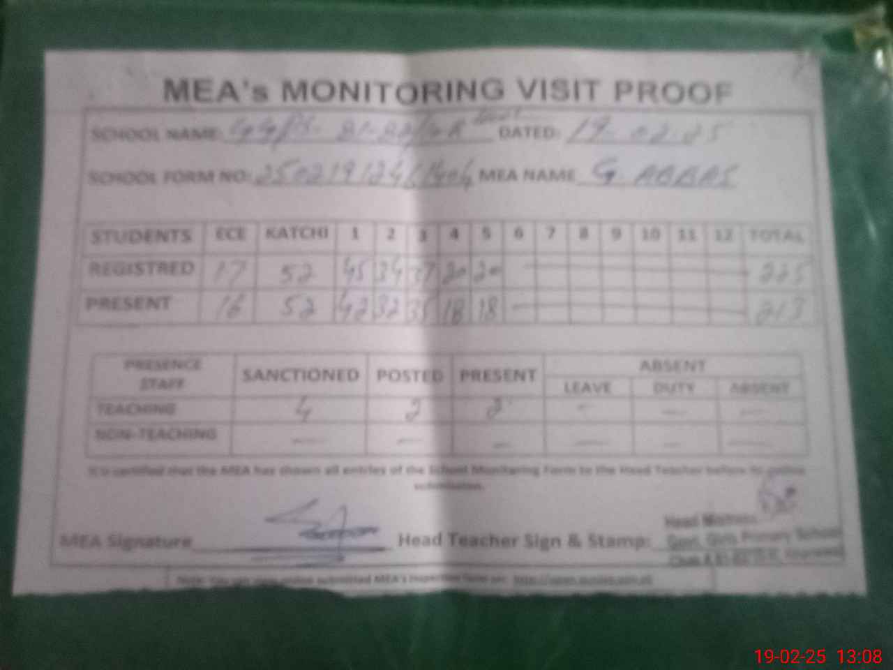 | Attendance Register | Head Teacher | MEA with School | Visit Proof |
