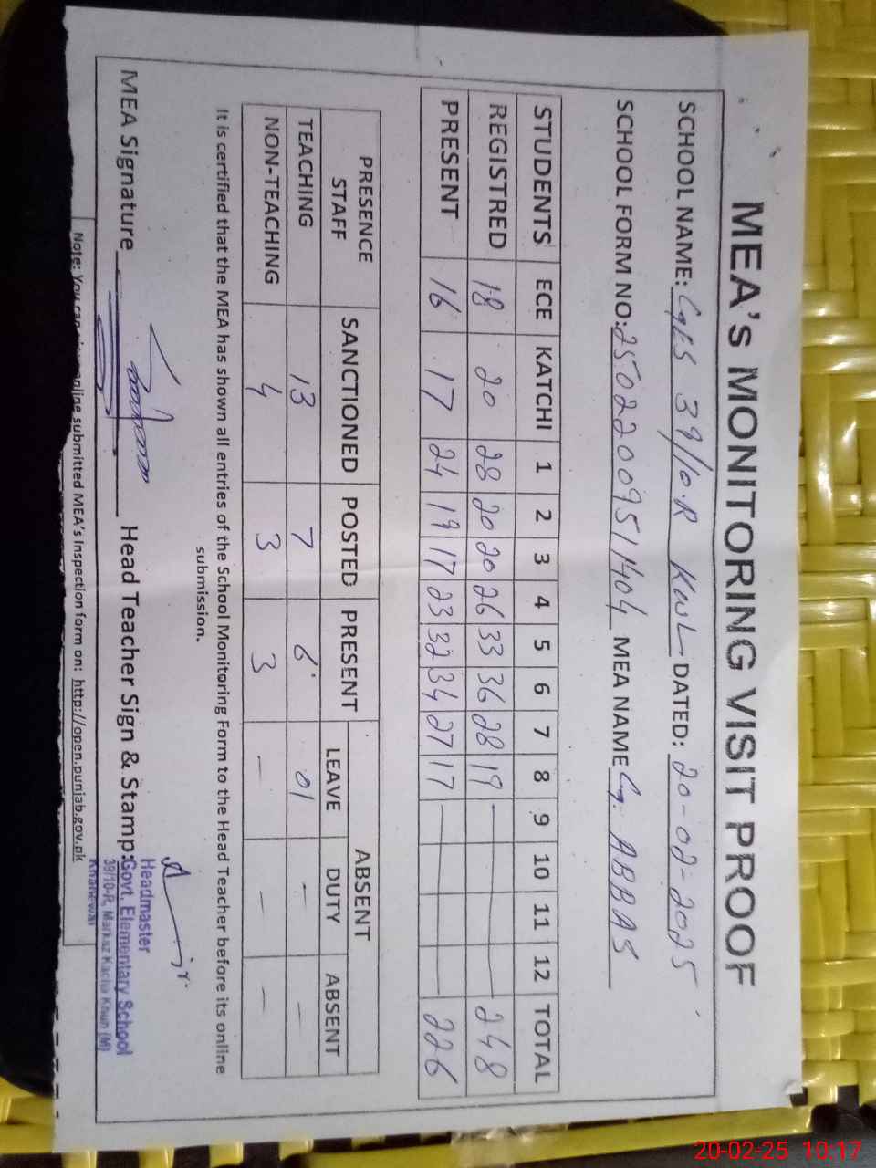 | Attendance Register | Head Teacher | MEA with School | Visit Proof |