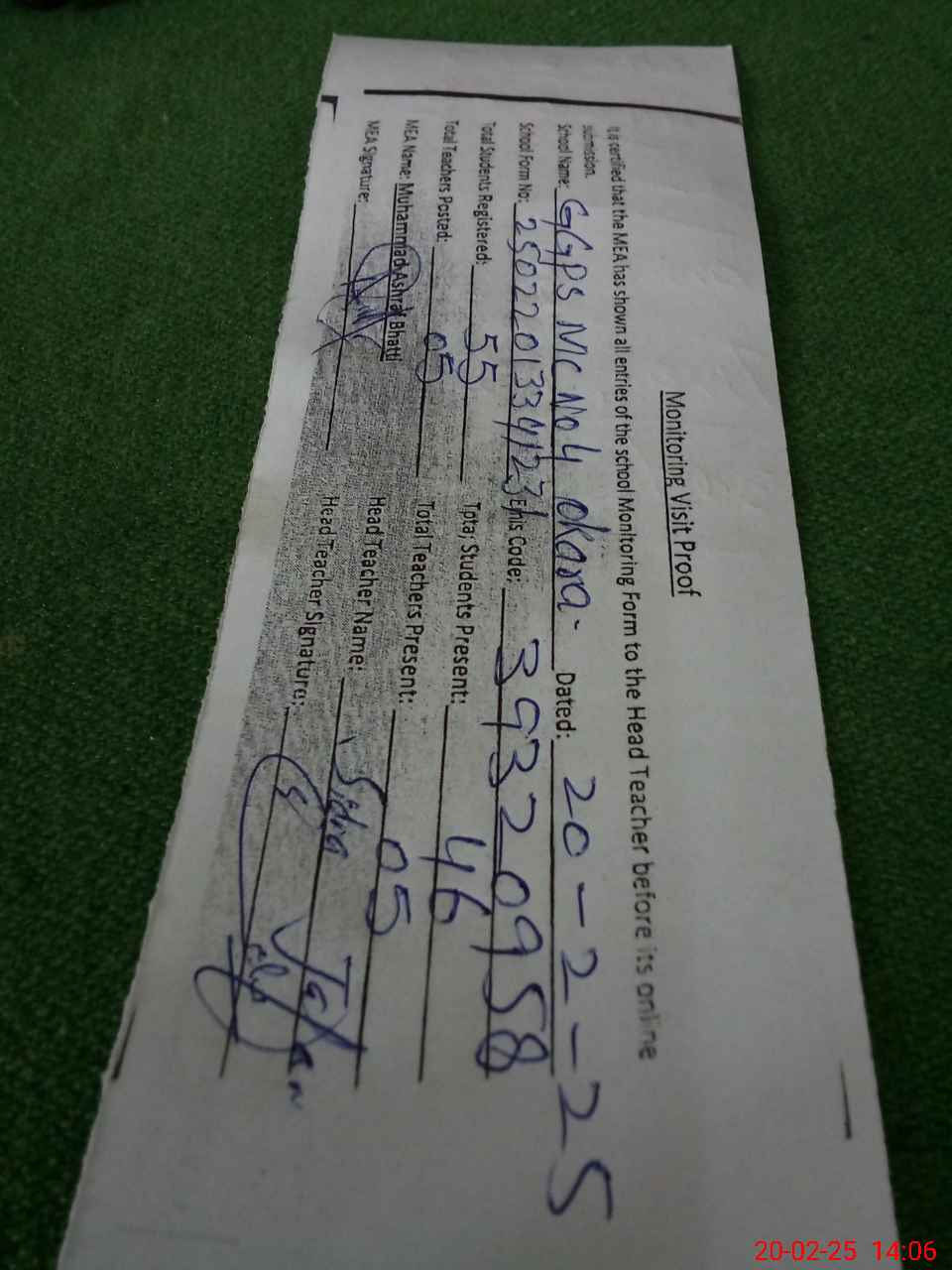 | Attendance Register | Head Teacher | MEA with School | Visit Proof |
