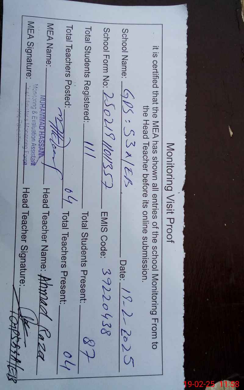 | EMIS Code: 39220438 | Name of School: GPS CHAK NO. 53 EB A | |||