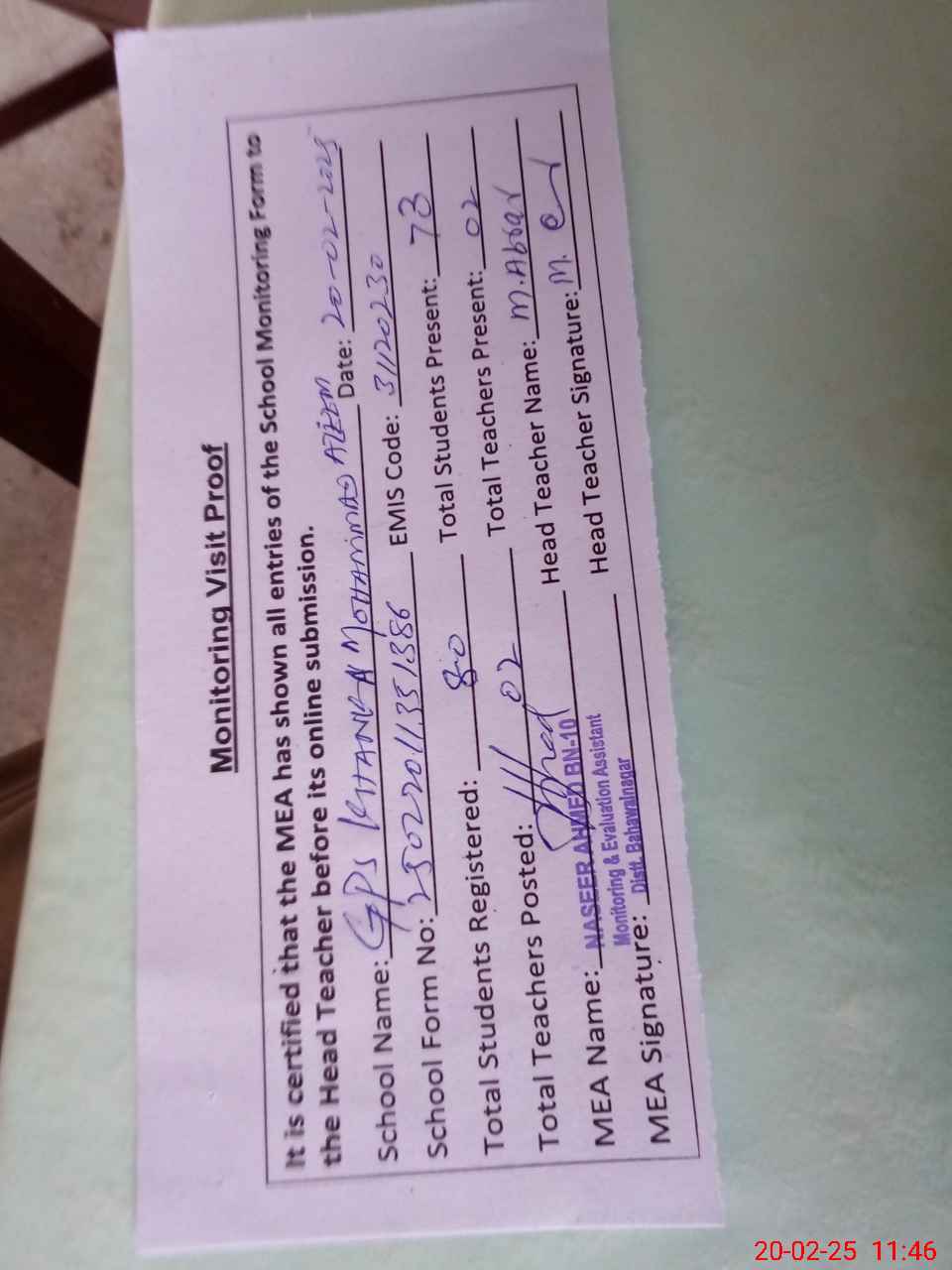| Attendance Register | Head Teacher | MEA with School | Visit Proof |