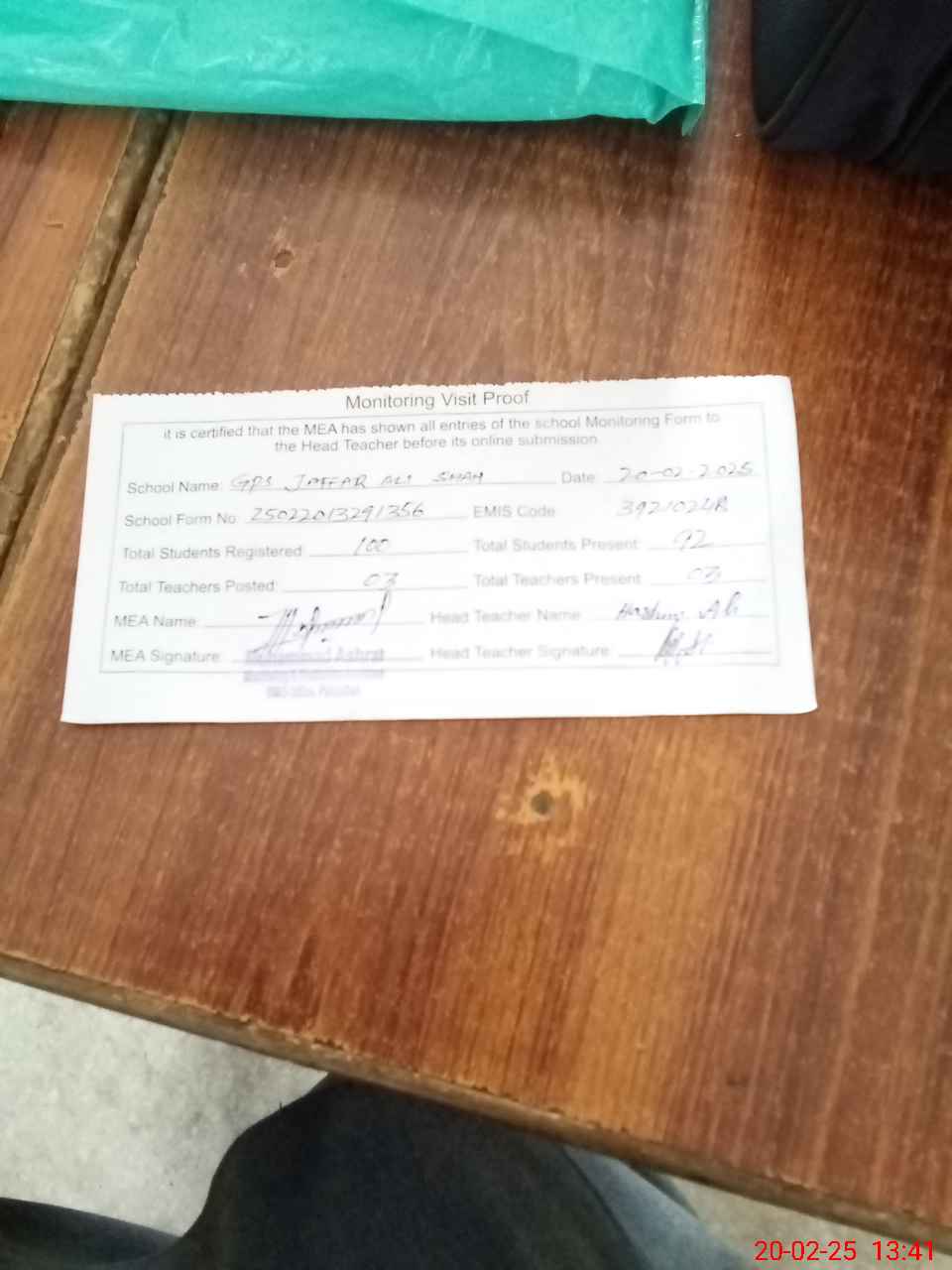| Attendance Register | Head Teacher | MEA with School | Visit Proof |