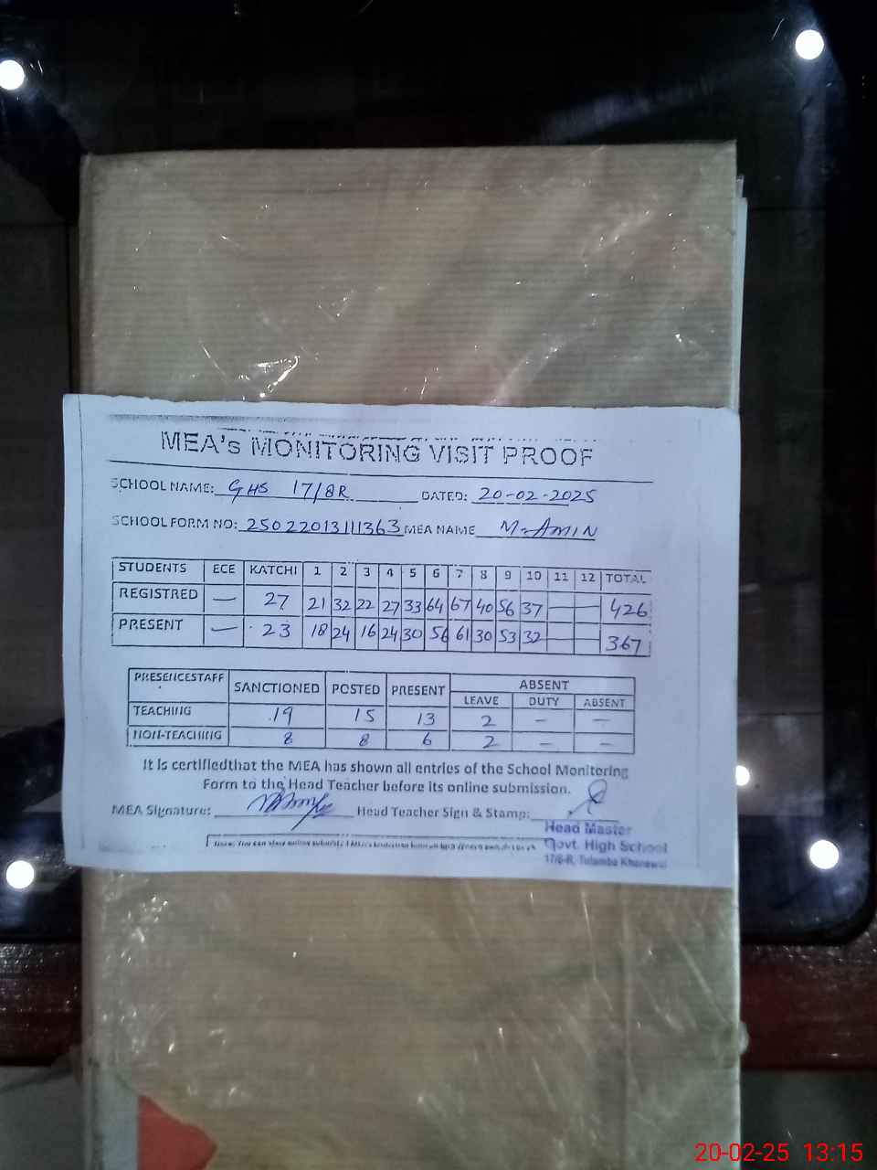 | EMIS Code: 36430018 | Name of School: GHS 17/8-R, TULAMBA | |||