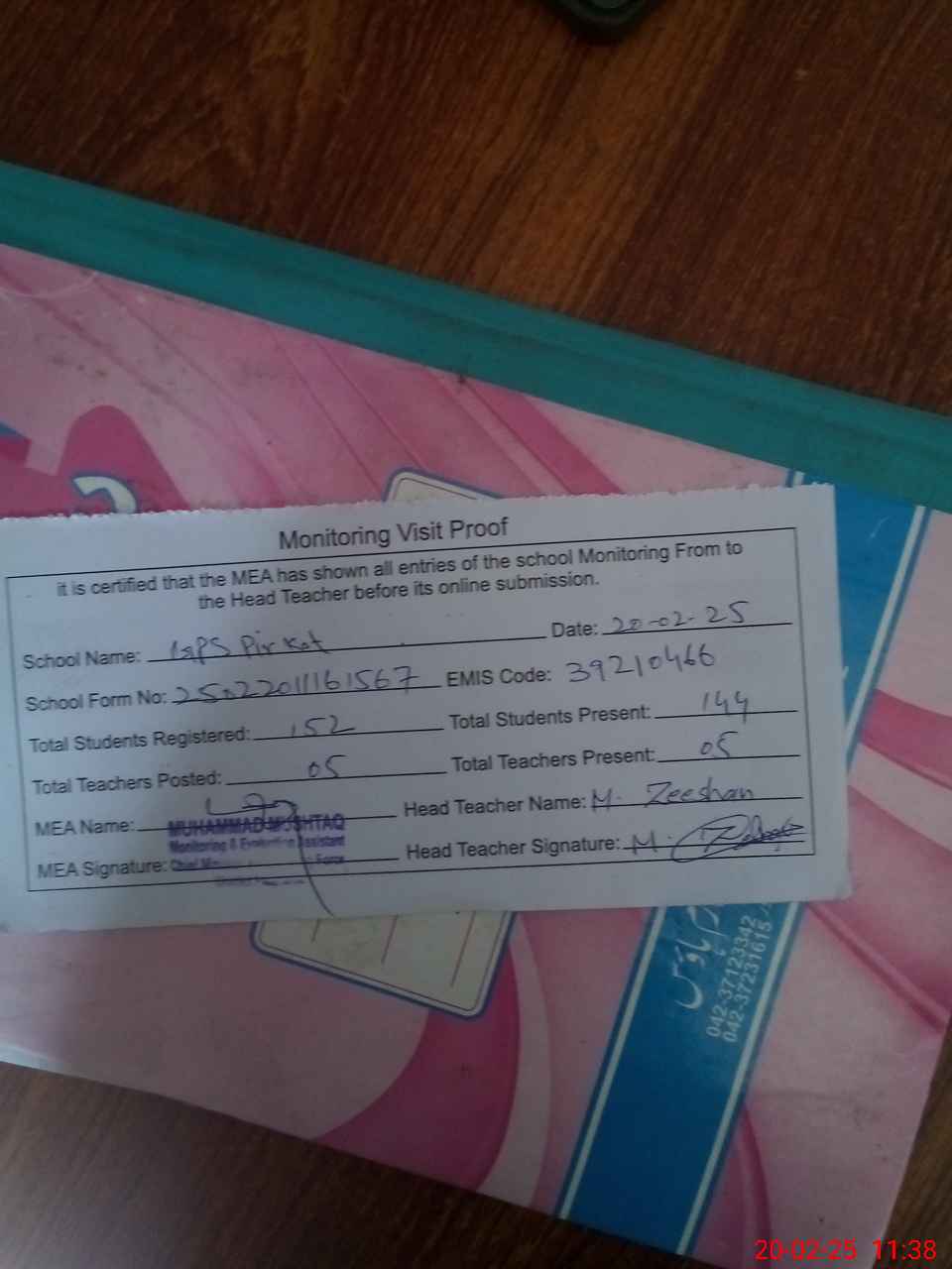| Attendance Register | Head Teacher | MEA with School | Visit Proof |