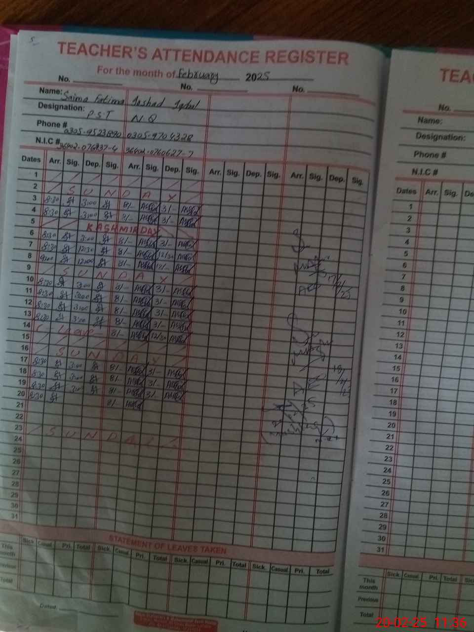 | CNIC | Full Name | Designation | R/C | Absence During Last Calender Month |