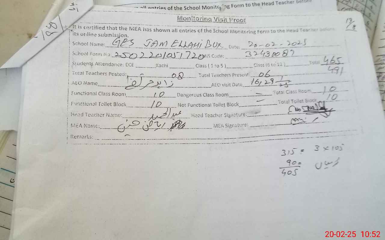 | EMIS Code: 32430087 | Name of School: GES BASTI JAM ELLAHI BUX CHACHAR | |||