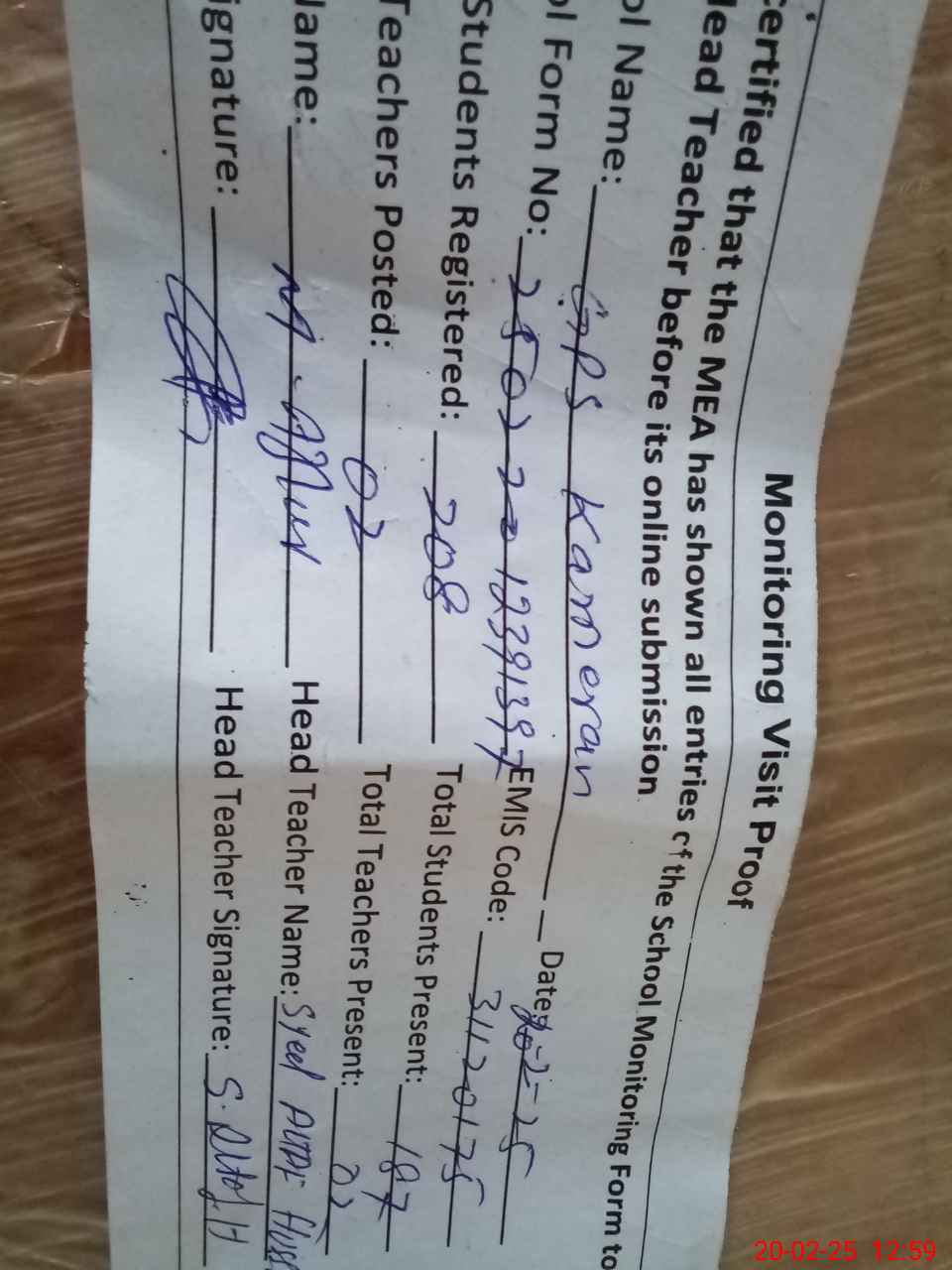 | Attendance Register | Head Teacher | MEA with School | Visit Proof |