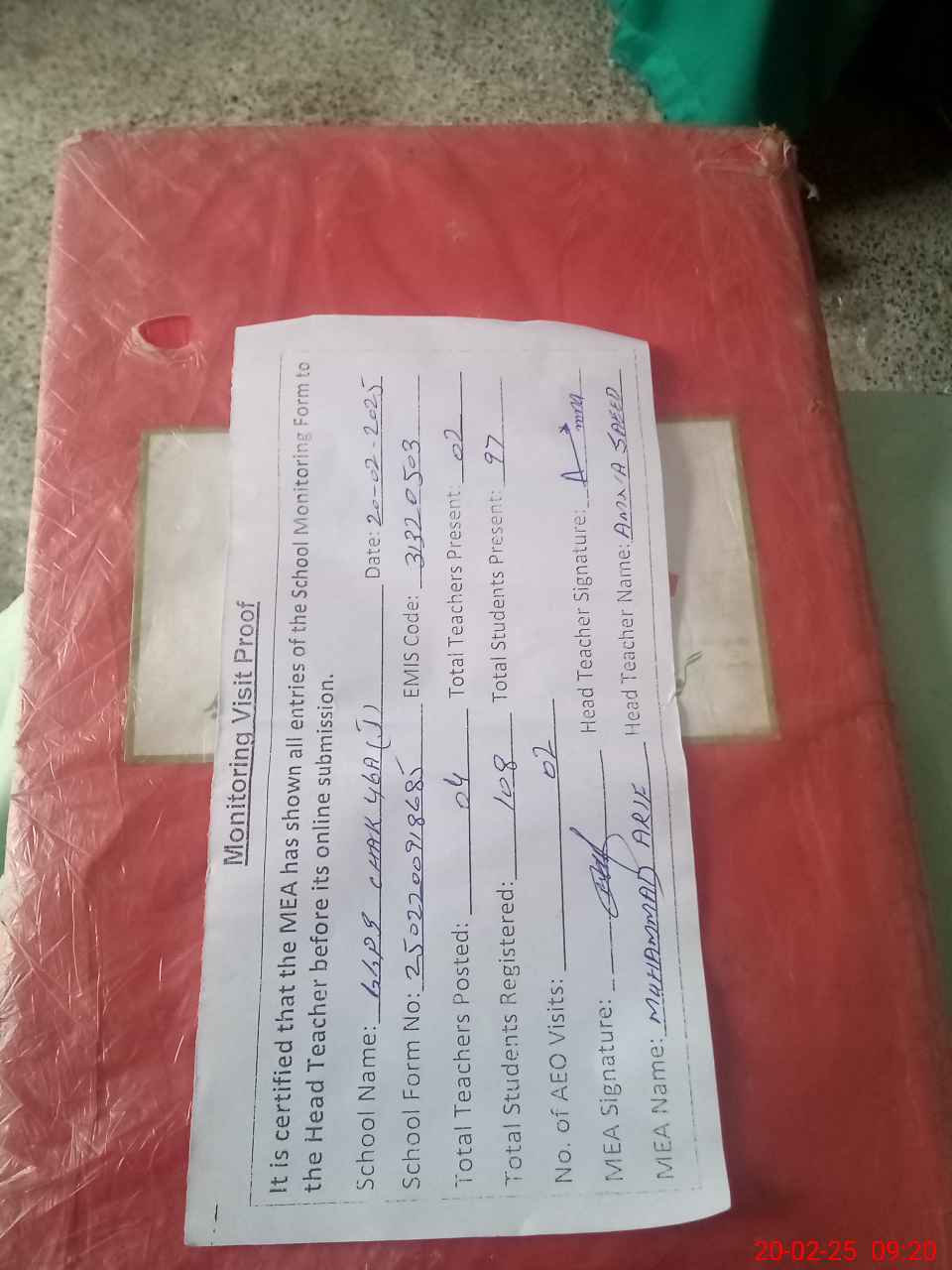 | Attendance Register | Head Teacher | MEA with School | Visit Proof |