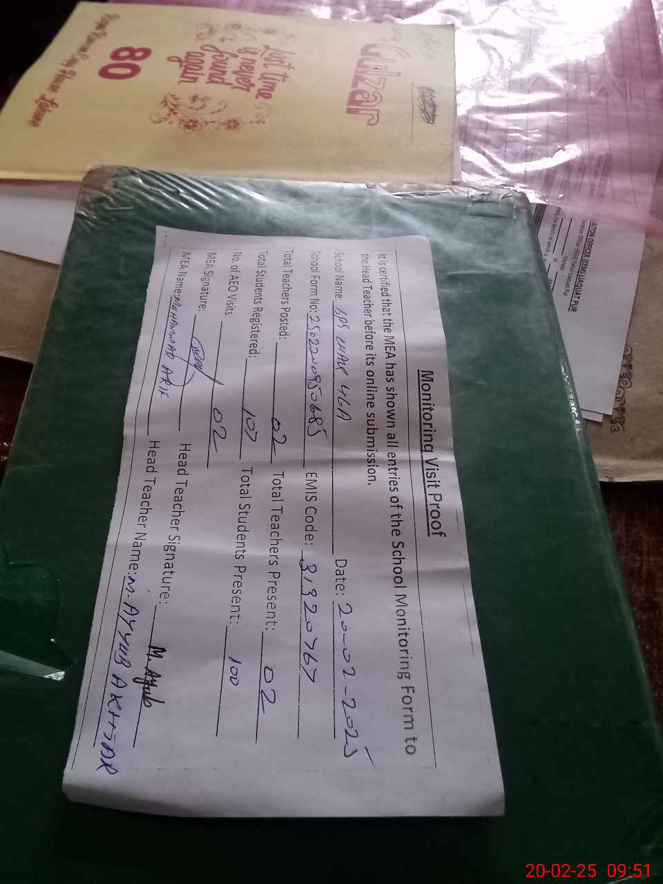 | Attendance Register | Head Teacher | MEA with School | Visit Proof |