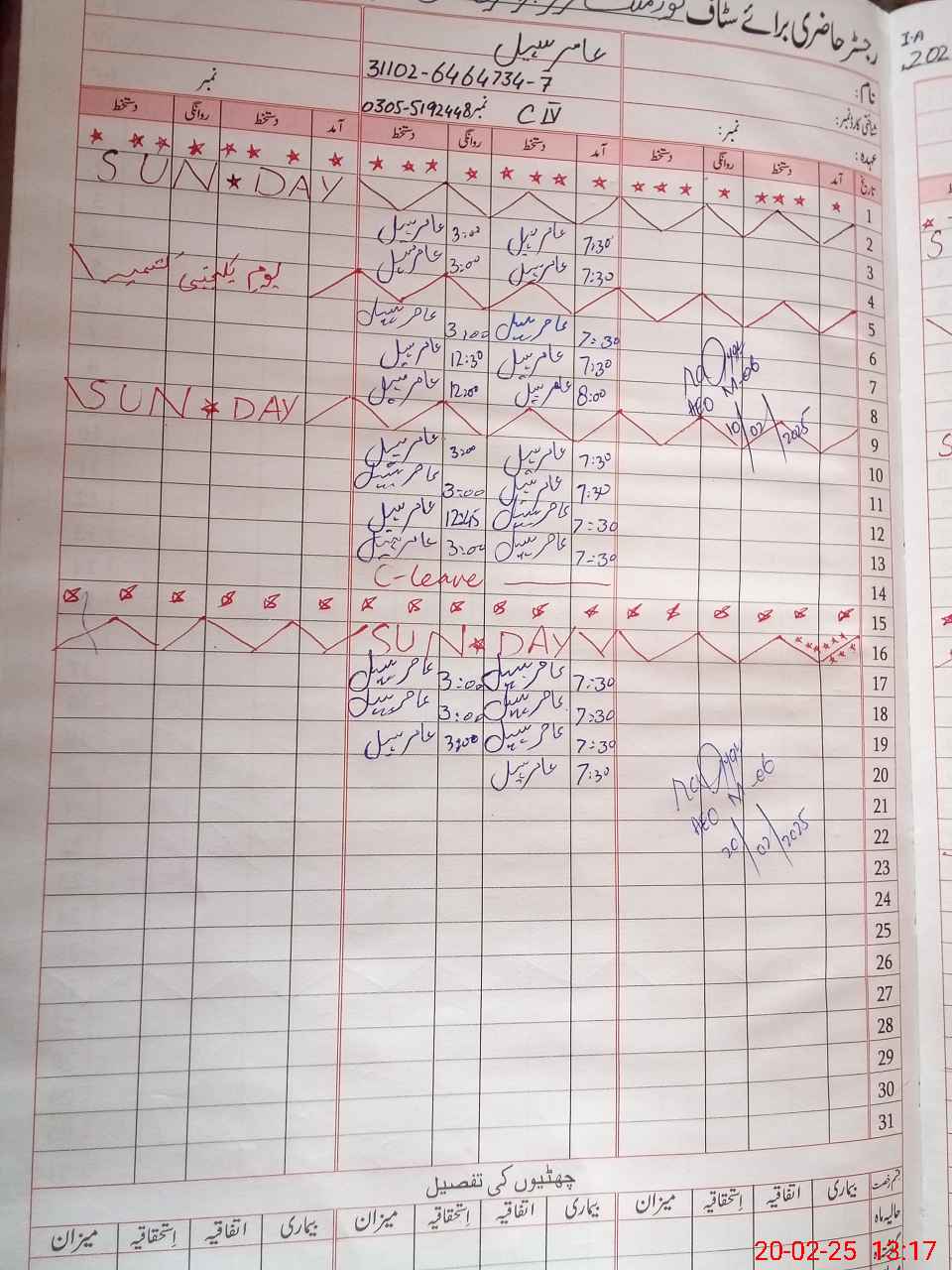 | CNIC | Full Name | Designation | R/C | Absence During Last Calender Month |