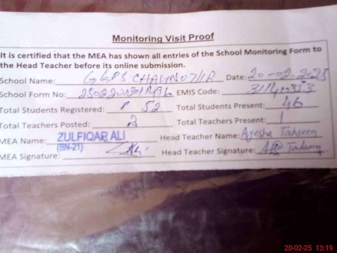 | Attendance Register | Head Teacher | MEA with School | Visit Proof |